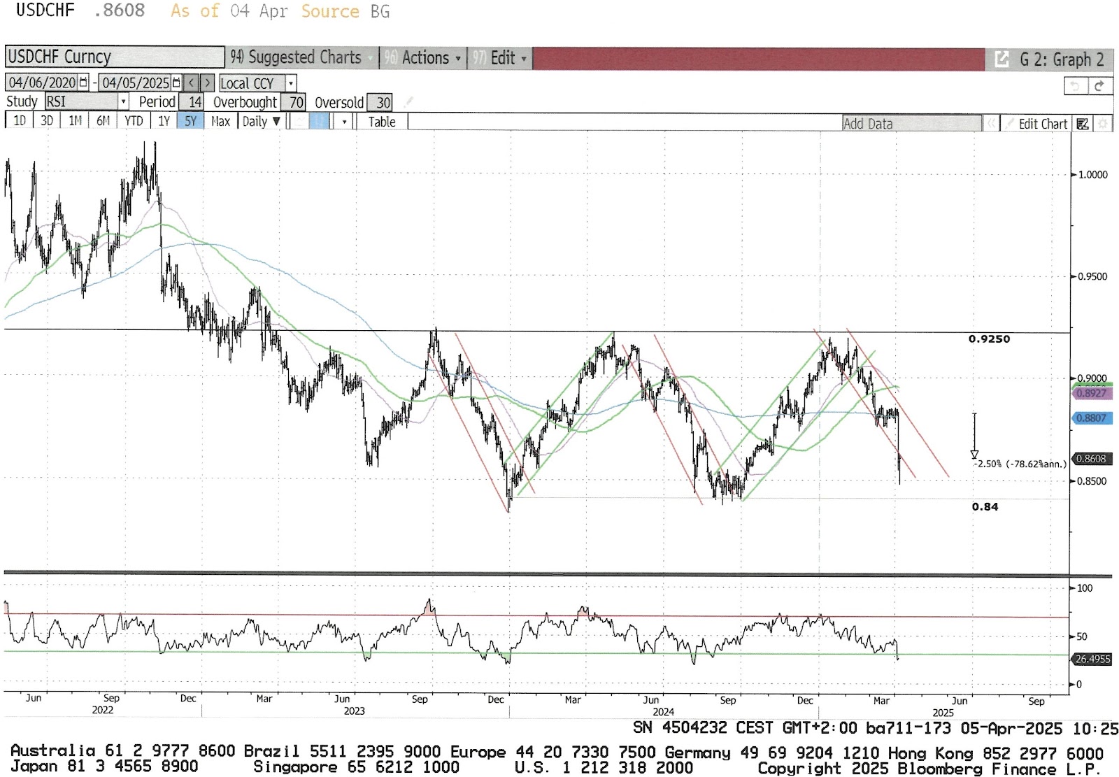 Per fortuna il dollaro è tornato ad apprezzarsi contro franco: non vi nascondiamo che eravamo preoccupati... le conseguenze di un eccessivo rafforzamento del franco le conosciamo bene e vedere di nuovo la BNS muoversi verso tassi negativi ci crea un insopportabile fastidio allo stomaco. Speriamo che il movimento in atto sia un classico ritracciamento del movimento ribassista avviatosi ad inizio aprile. Se così fosse, possiamo immaginare che recuperare il 50% di questo movimento non è impossibile e potrebbe portare il dollaro/franco attorno agli 84 centesimi nelle prossime settimane.